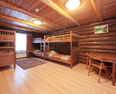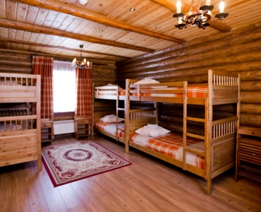 три двухъярусных кровати, большой стол, 6 стульев, санузел с душевой кабиной, TV, чайник, чайные пары, гостиничная парфюмерия.