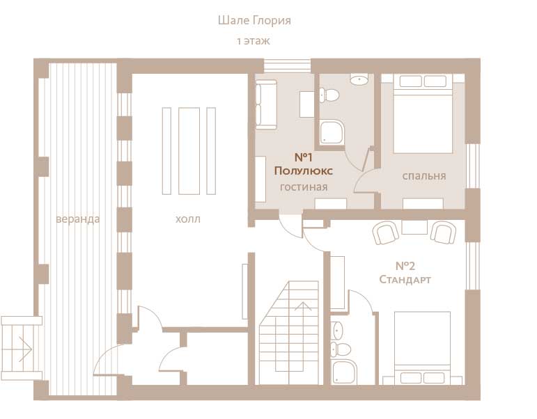 2-спальная кровать, диван или кресла, столик, санузел с душевой кабиной, TV, холодильник, чайник, чайные пары, гостиничная парфюмерия.