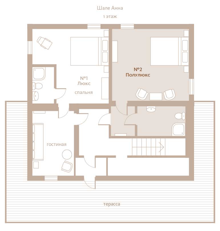2-спальная кровать, диван или кресла, столик, санузел с душевой кабиной, TV, холодильник, чайник, чайные пары, гостиничная парфюмерия.