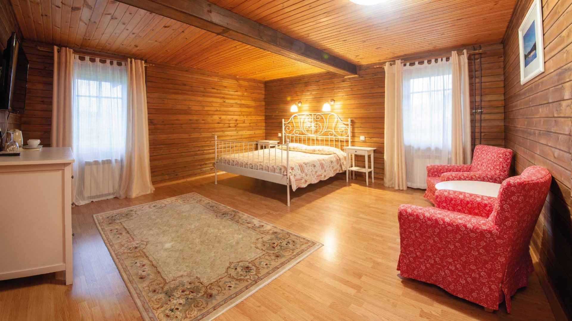Помимо большой двуспальной кровати в некоторых номерах есть дополнительный раскладной диван или кресла, так что здесь удобно разместятся и родители, и дети.