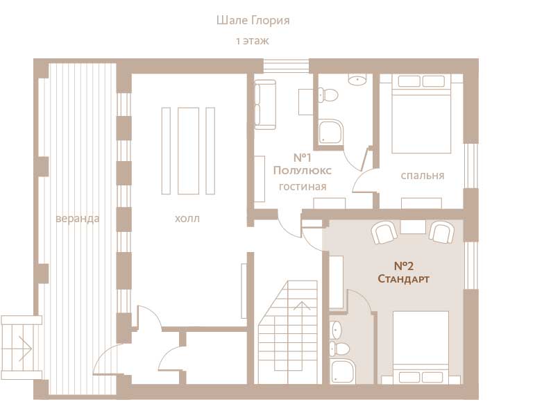 2-спальная кровать, кресла, санузел с душевой кабиной, TV, чайник, фен. В комплекте на каждого гостя: 2 полотенца, гель для душа, шампунь.