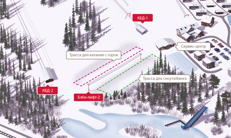 Для любителей скоростных спусков со снежных горок мы построили отдельную трассу для сноутюбинга. Склон находится за сервисным центром (на спуске к озеру) и оборудован отдельным подъемников (ищите на схеме «Трасса для сноутюбинга»).